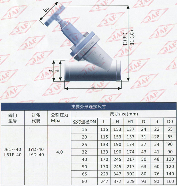J表示截止閥 A表示結構形式為直角式 D表示對焊連接 40代表公稱(chēng)壓力為4.0MPa 40后不標注表示閥體材質(zhì)為鍛鋼。